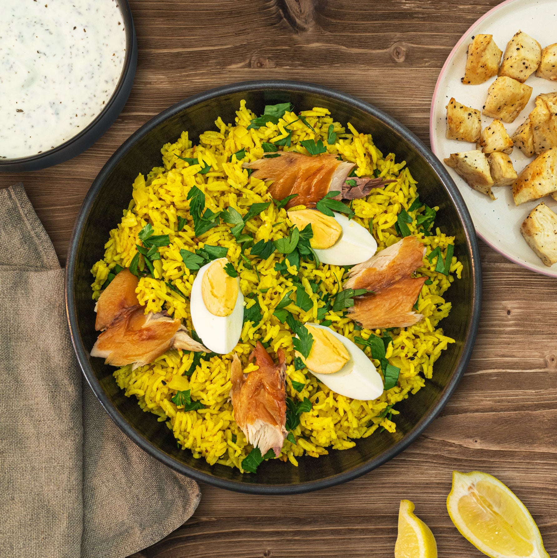 Genießen Sie diese köstliche Fusion aus britischer und indischer Küche mit rauchigem Fisch, duftendem Reis und der perfekten Menge an Gewürzen.